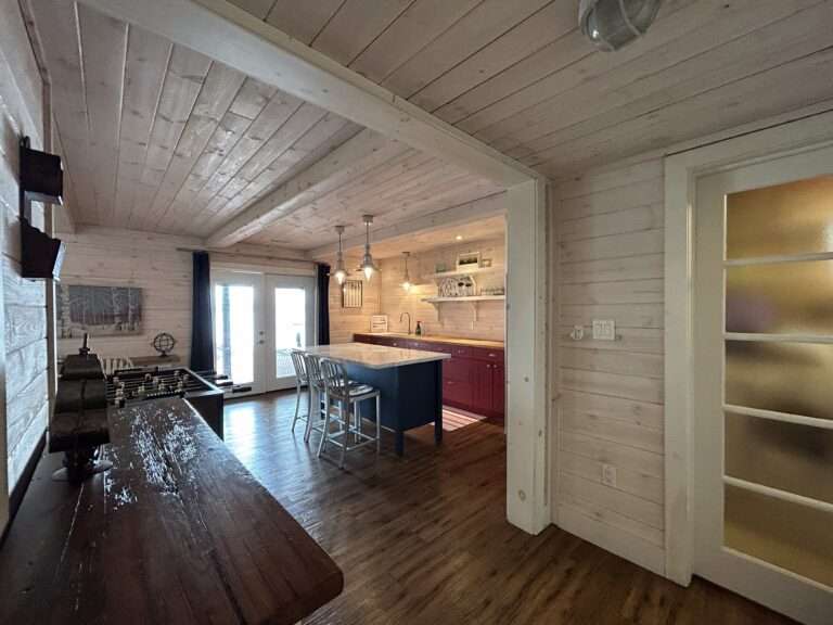 This fantastic cottage property comes completely turn key and ready to enjoy. There are 3 main bedrooms on the upper level, an extra guest bedroom on the main level. and a large Bunkie, to ensure plenty of room for family and friends. The landscape here is quite flat, and this level property has a full walkout lower level to the huge deck area which sits right next to the beautiful sand beach. Easy, sand packed shallow entrance into the water with about 2.5 – 3ft of water off the end of the dock, with room to swim and park the boat. The south exposure ensures plenty of sunshine for endless days on the water. Inside, you will find the cottage bright and open with great views out over the lake. Large kitchen/dining area on the upper level and another prep kitchen, or summer kitchen, on the main level. Large upper deck with wrap around glass rails comes complete with all the patio furniture and loungers. With over 1000 sq ft of lakeside decking the is ample room for enjoying outdoor living by the water. The bonus room is the large double car garage at the back of the cottage which is currently used mostly as an entertainment area with lighting, screen doors covering the roll up door opening, bar area and TV. Endless possibilities for this area such as games tables, golf simulator. workout / yoga room and more. Central air conditioning in the cottage, and whole house automatic backup generator provide summer comfort and year round peace of mind. This cottage vacation property currently has a successful rental record, and does have rentals booked for this summer to take into account.