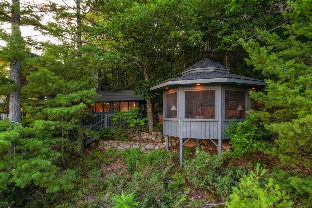 At the waterfront, over 150 feet of grandfathered dock spans beautifully exposed Canadian Shield shoreline. On one end, you’ll find a boathouse with brand-new cribs and docking; on the other, a single-slip boathouse with living accommodations above. The expansive party dock and gazebo between them complete the ultimate waterfront experience.