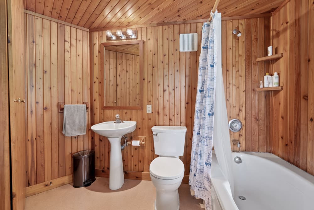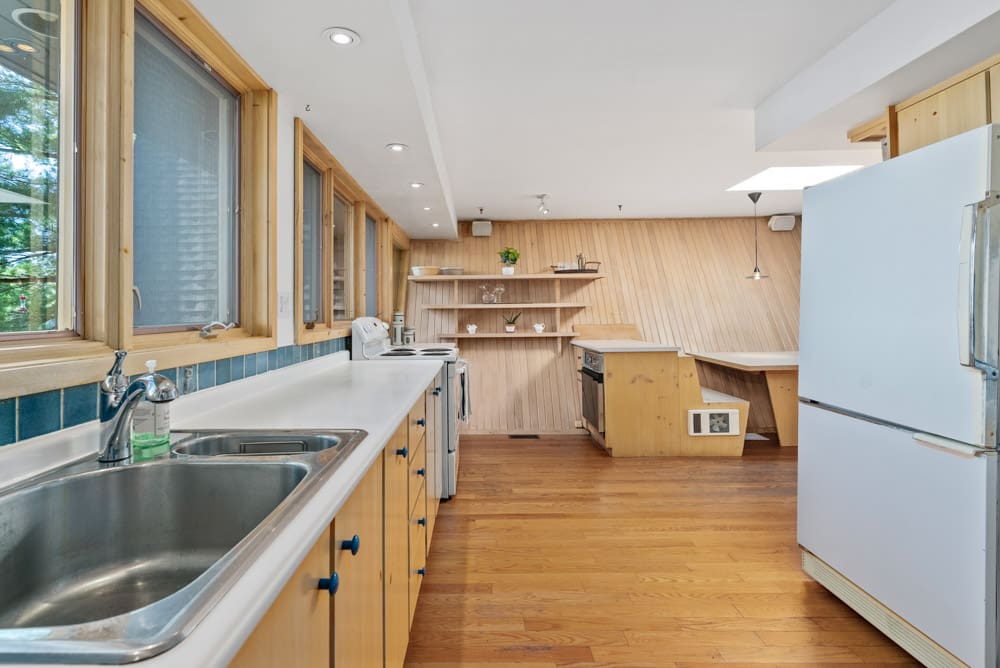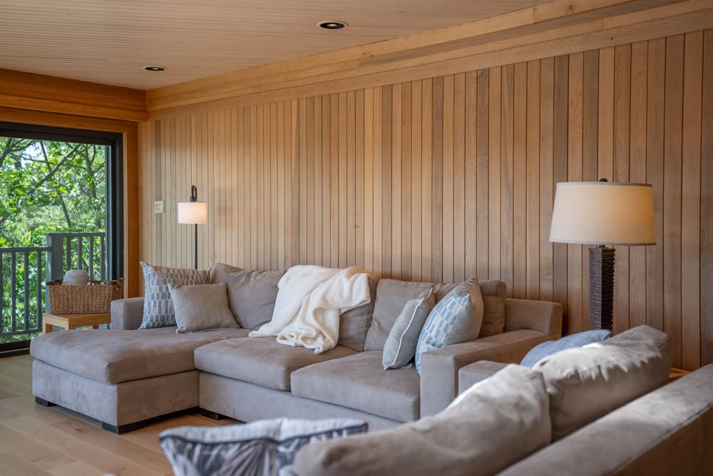 Nestled among sweeping pines, the 4-bedroom, 3-bathroom, 3,099 sq. ft. cottage sits with grandfathered setbacks close to the water and boasts a design that captures the mesmerizing lake views from nearly every room. A wrap-around deck extends across the entire façade, with walkouts from all main-floor and lower-level bedrooms, as well as from the kitchen, living room, and family room.