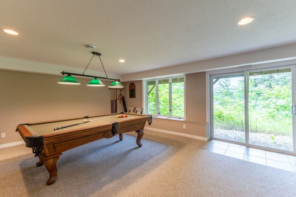 The bright and spacious walkout basement is perfect for rainy days, featuring an entertainment area with a pool table and ping pong table. The work area, equipped with STARLINK high-speed internet and a sit/stand desk, makes working remotely a breeze.